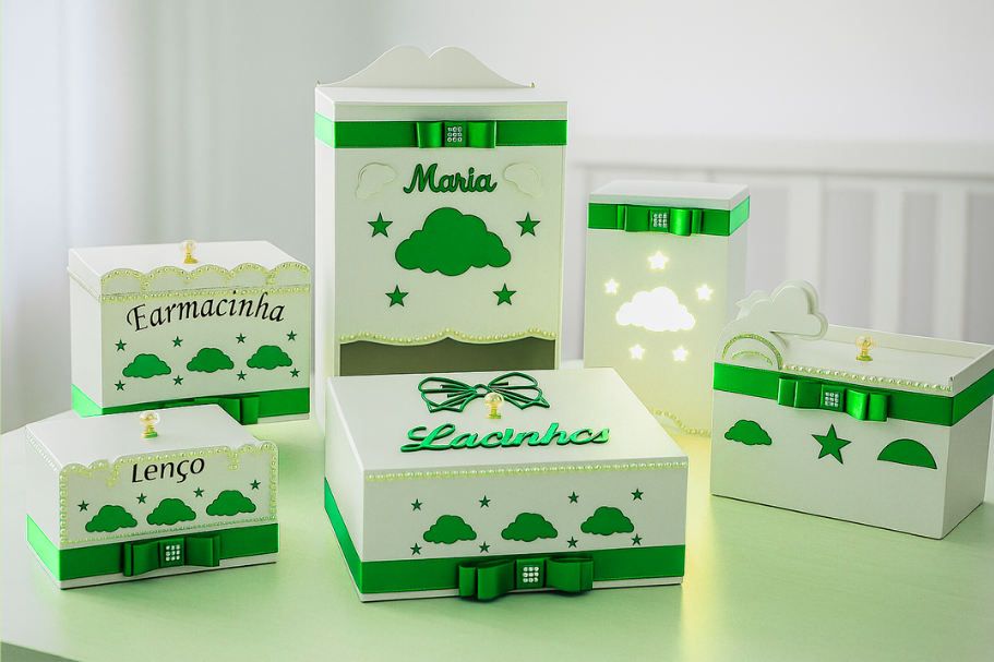 Kit Higiene Bebê Nuvem na cor Verde – Porta Fraldas, Farmacinha, Potes, Lixeira